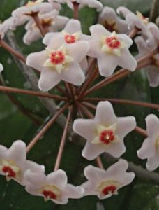 Ornamental characteristics: Glossy, pointed leaves cling to slender vines; small clusters of velvety, star-shaped flowers emerge from tight, waxy buds. Each small flower supports a distinctive, star-shaped corona with a red center. Richly fragrant.